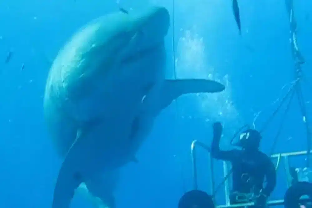 Es una idea terrible y malísima abandonar una jaula de buceo con el fin de chocar la aleta con un colosal tiburón blanco de seis metros. Pero, a pesar de ello, un turista acometió esta ‘hazaña’ (si es que se le puede llamar así) cerca de la isla de Guadalupe (México). En este vídeo, que ha sido publicado en Facebook por Mauricio Hoyos Padilla, el autor de esta temeridad, puede verse cómo el buceador prueba su suerte dando cachetes a la aleta de tiburón mientras éste da vueltas con desgana alrededor de la jaula.