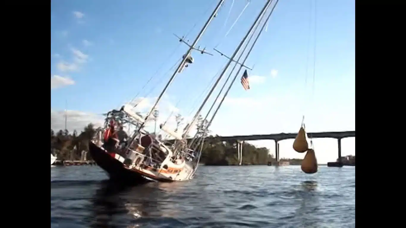 La genialidad trata de la gran dificultad que entraña esta maniobra. El secreto para realizarla, como veréis en el vídeo, es llenar dos enormes depósitos de agua con el fin de que pesen una tonelada cada uno. Después, se cuelgan en vertical al mástil con el fin de que actúen de contrapeso, escoren la embarcación y esta pueda pasar por debajo del puente.